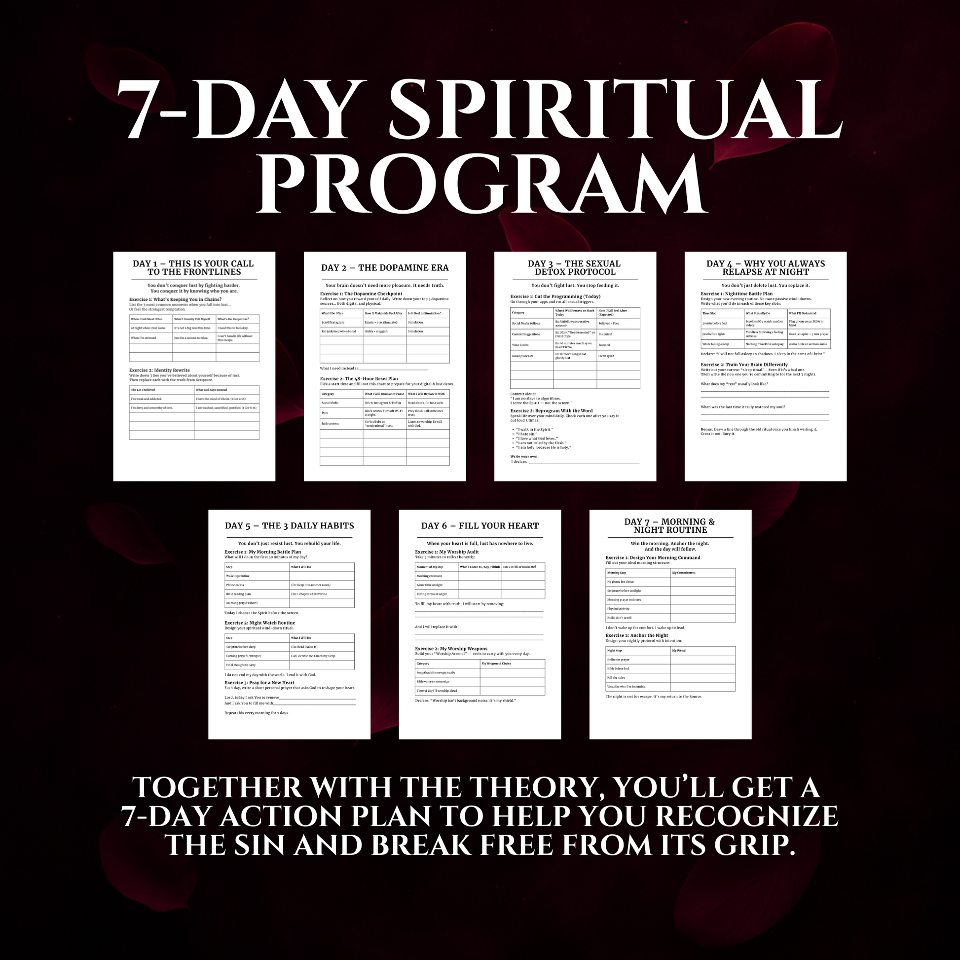Each guide includes a 7-day spiritual program focused on one deadly sin, combining Scripture, reflection prompts, and actionable exercises. You’ll also receive journal pages and summary sheets in PDF format, ready for instant download.