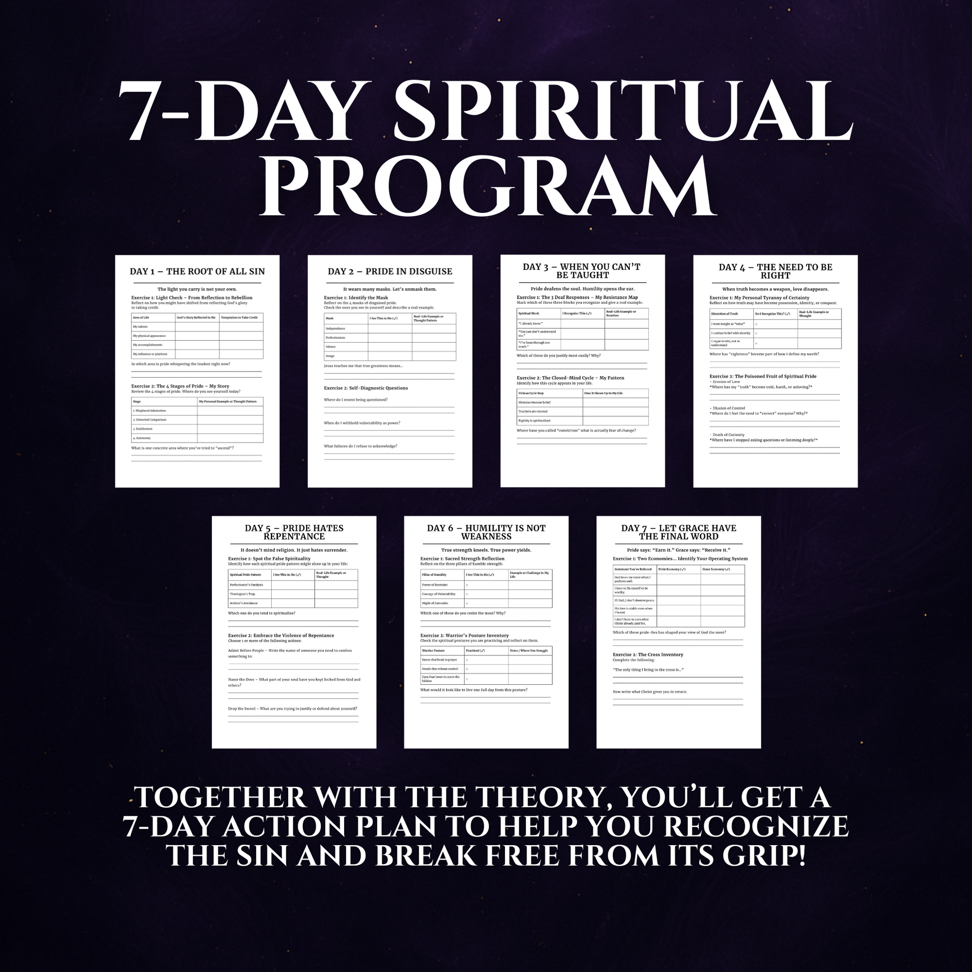Each guide includes a 7-day spiritual program focused on one deadly sin, combining Scripture, reflection prompts, and actionable exercises. You’ll also receive journal pages and summary sheets in PDF format, ready for instant download.